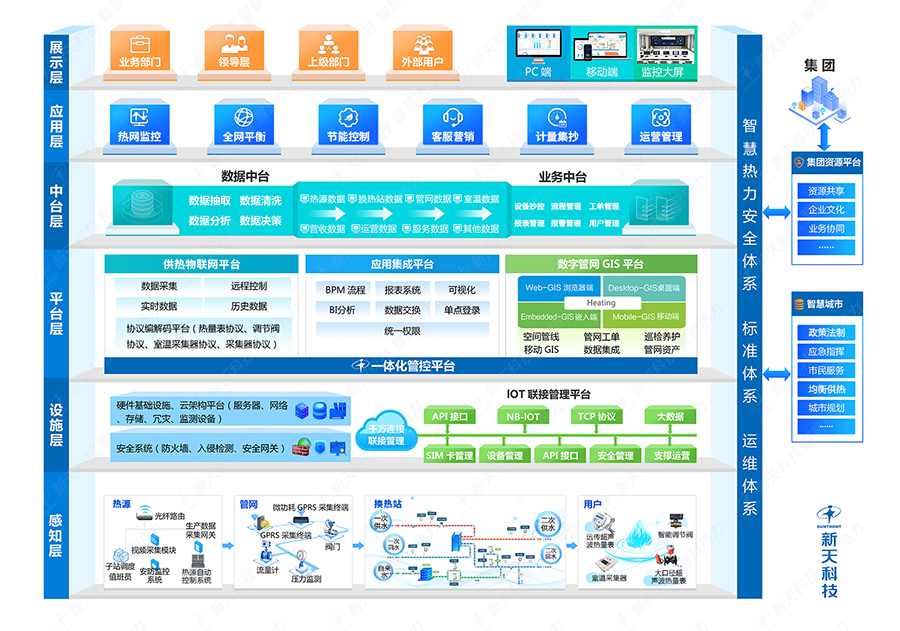 围绕热力企业战略发展目标,整合云计算、大数据和GIS地理信息、物联网技术,实现供热系统"源-网-站-户"各个环节供热设备的实时感知和城域化汇集管理,通过供热数据建模分析、管网空间分析、管网仿真模型,以更加精细和动态的方式管理供热系统的整个生产、运营和服务流程,并做出相应的处理结果辅助决策建议,以更加"智慧"的方式辅助热力公司进行管理和运维,从而保证可靠供热,降低能耗,提升运营管控能力,实现经济效益和社会效益的不断增长,实现能源数字化管控。